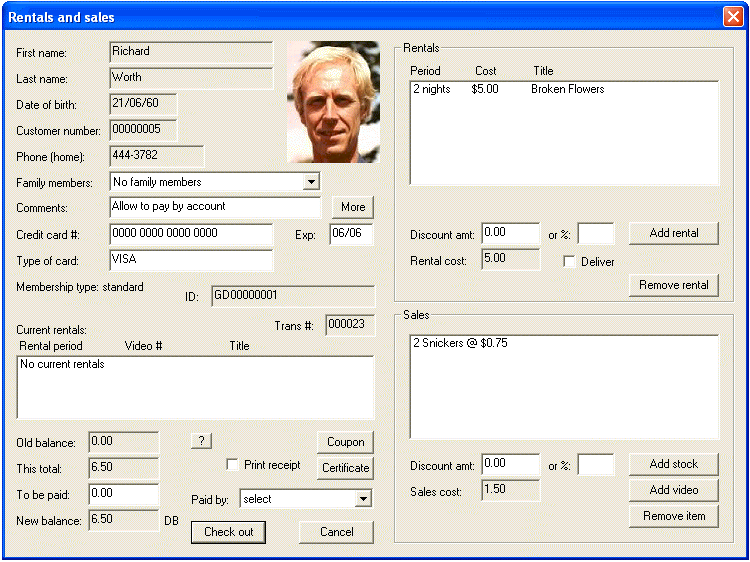 To rent videos/sell merchandise to a registered customer, click on the red arrow icon on the toolbar or press F2.